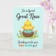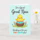 This design shows a bright yellow baby bird peeking out as it breaks through a decorated eggshell, nestled in a brown woven nest, with a sweet forward gaze that feels like a friendly hello 🐰. The shell is wrapped with a pink-and-white zigzag band and a teal section sprinkled with small white star shapes, adding a party-like touch without crowding the scene. A soft sky-blue background leaves plenty of open space, keeping the focus on the little bird’s orange beak, tiny wings, and blush-pink cheeks. Along the bottom, a strip of green ground is dotted with simple orange and pink flowers and thin leafy stems, like a gentle garden border 🌷. Curved, flowing text sits above the illustration in a dark, contrasting color, arcing lightly across the blue area. A second line of thicker, more upright lettering appears below the nest near the lower edge, standing out clearly against the lighter background. The overall palette leans on sunny yellow, calm blue, and fresh green, with small pops of pink and teal to keep the eye moving. The nest sits centered above the green base, with the patterned egg and star details clearly visible around the bird.