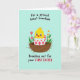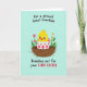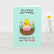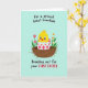 This card features a chubby yellow baby bird peeking out of a decorated eggshell, its dark round eyes meeting yours with a tender, friendly look and soft pink cheeks. The eggshell is light blue with white diamond shapes and red dots, finished with a scalloped rim that feels festive and delicate. The little bird sits snugly in a textured brown nest, giving the scene a cozy, close-to-you mood like a gentle springtime hello 🐣🌷. Sprigs of green leaves and small wildflowers in red, orange, and white curl around the nest, adding a fresh garden setting. A calm aquamarine background keeps everything airy and soft, letting the bird and shell stand out. At the top, a hand-drawn message appears in black lettering, and at the bottom a second line is set in red, drawing the eye like an affectionate note left just for someone special 🐇. The lower red line sits beneath the nest while the patterned shell shows white diamonds and red dots against the soft blue.