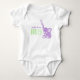 Cute baby elephant sitting blowing heart bubbles in purple and bright green romper or t-shirt. Personalize with your own baby's greeting and name. Ideal as a new baby gift or baby shower gift where the name is known. Currently reads hello I am Bailey. Also great to pack in your hospital bag as a first item of clothing for your new baby so everyone knows his or her name. © Item drawn and designed exclusively by Sarah Trett. www.sarahtrett.com for www.mylittleeden.com on zazzle.