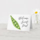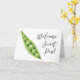 Cute baby congratulations greeting card featuring a hand drawn illustration of a green peas with cute faces. The text says "Welcome Sweet Pea!"