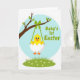 This design shows a bright yellow baby bird peeking out of cracked white eggshell pieces, its wide eyes and tiny smile giving it a sweet, friendly look. It hangs from a leafy tree branch by a green ribbon, like a small gift being offered with gentle care 🌷. Behind the bird, a soft sky-blue circle sets a calm spring backdrop, keeping the focus on the little character. Along the bottom, a band of green grass is dotted with small white flowers that feel like quiet company around the scene. The colors stay sunny and fresh—yellow, green, and blue—with simple shapes and clear outlines that keep everything easy to read. A short greeting appears below the illustration in rounded green letters, centered and spaced neatly so it stands out without crowding the art 🐰. The branch curves across the upper area with a few scattered green leaves, and the ribbon drops straight down to the chick and shell.