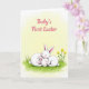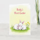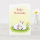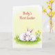 This card shows two stylized white bunnies cuddled close, with soft pink ears and rosy cheeks, sharing a tender, protective moment 🐰. The larger bunny gently cradles a smaller one that’s asleep, their closed eyes and relaxed shapes suggesting quiet affection and friendship. A plush, velvety look in the illustration makes their fur feel extra cozy and comforting. They sit on a wash of green grass that fades and flows like watercolor, giving the scene an easy springtime calm. Small yellow flowers dot the foreground like little sparks of sunshine 🌷. Behind them, the background shifts into a mellow yellow gradient that brightens toward the top, like early morning light. Along the top edge, a fuchsia cursive-style line of text announces a special “first,” centered above the pair. The letters sit against the glowing yellow sky, with the bunnies nestled below on the green field and blossoms.