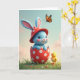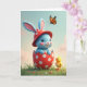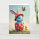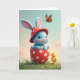 This greeting card features a sky-blue furry creature with long ears peeking out of a large cracked red eggshell, its cheeks lightly pink as it looks out with wide blue eyes 🐰. White polka dots decorate both the eggshell and a matching little hat, tying the scene together in a sweet, coordinated way. Nearby, a small yellow chick stands on green grass and tilts its head up toward the creature, as if sharing a shy first hello between new friends 🐇. Above them, an orange-and-black butterfly drifts across a pale blue sky, with soft pink clouds stretched thin in the background. The lighting feels gentle and airy, making the fur look soft and the eggshell edges look slightly glossy. A short Easter greeting sits near the top in a light, spring-like color, with smaller words placed beneath it in a darker shade for contrast. Around the grass, tiny multicolored pebbles and individual blades are visible, and the butterfly’s wing markings are crisp against the open sky.
