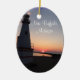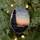 New Buffalo Michigan Sunset Lighthouse Ornament shows a photo of the sunset over the lighthouse in New Buffalo, Michigan