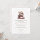 This sweet simple invitation is for a baby shower event, with the theme 'New chapter'. With the text - "A new chapter is about to be told". The card features illustrations of a watercolor stack of floral decorated books and the back has a is light blush pink peonies pattern. Classic old english text style font for a feeling of old kids illustration books.