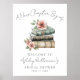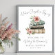 A charming welcome sign for a bridal shower inspired by the “A New Chapter Begins” theme. The design features a watercolor stack of three books in tan, gray, and green hues, accented with delicate wildflowers and greenery in soft blush pink, yellow, blue, and purple for a cheerful and inviting look.