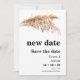 Simple pampas grass, new date wedding save the date card. This design features a watercolor pampas grass image at the top and bold black text. The back is organized with a more detailed message from the couple.