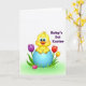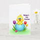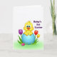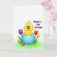 This card shows a bright spring scene with a newly hatched little yellow bird peeking out of a sky-blue eggshell, its big blue eyes and tiny orange beak giving it a sweet, friendly look. Small spiky tufts on its head add to the youthful charm, as if it’s leaning forward to greet someone close by. At the bottom, green grass frames the shell, fading into a light green background that feels soft and airy. Nearby, tulips stand like gentle companions—one purple on the left, one red on the right, and a yellow bud close by—while a pink tulip lies sideways near the lower left, like it was set down with care 🌷. The warm lighting and smooth illustration style make the scene feel welcoming, like a shared moment between friends or a tender hello. On the right side, deep purple text is placed in a flowing, decorative style, balancing the character and flowers without crowding them. The cracked eggshell edges are outlined clearly, with the blue shell pieces curving around the chick above the grassy base 🐣.
