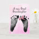 Baby girl footprints with a pink satin bow on the toe on a pink and white gingham background.
