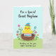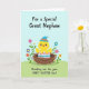This card features a bright yellow hatchling peeking out of a decorated eggshell, nestled in a twiggy nest, with its tiny wings spread as if reaching for a hug 🐰. A small pointed cap with blue and red stripes sits on its head, and its wide eyes and rosy cheeks give it a sweet, friendly look that feels like a gentle hello from someone close. Around the main scene, small five-petal flowers in pink, yellow, blue, and orange cluster along thin green stems, adding a soft spring garden feel 🌷. The background fades from a pale blue sky at the top into rolling green ground below, keeping the setting simple and outdoorsy. The illustration uses crisp outlines and flat areas of color, making the shapes easy to read and the details charming without being fussy. A short greeting appears near the top in a warm, easy-to-see color, while a smaller line of text sits closer to the bottom in a matching tone. The nest is drawn with curved brown twigs, and scattered blossoms frame the hatchling like a loose floral border.