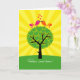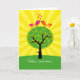 Two birds, sitting on a tree, K-I-S-S-I-N-G! Colorful stylized birds on top of a tree with heart leaves and yellow sun rays radiating out. A cheerful congratulations card for any couple starting out in a new home.