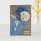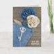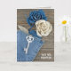 Denim roses in blue jean pocket with antique key on rustic barn wood for new home announcement