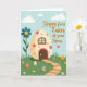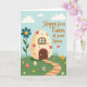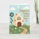 This design shows an egg-shaped little home in soft cream with tiny pink floral patterns, set on a green hillside that feels like a cozy place two people might start a new chapter together 🐰. A rounded door and an arched window sit on the front, both outlined by a pale pink arch that makes the entrance look extra welcoming. A peach-colored path curves upward through the grass, like it’s guiding a pair of close friends toward a shared visit. The sky is light blue with puffy white clouds, keeping the scene airy and calm. Across the foreground, small flowers in white, pink, yellow, and blue scatter through the grass, adding gentle spring color 🌷. Several decorative eggs rest around the hill, each with simple patterns like dots, stripes, and small blossoms. In the upper right, the message “Happy first Easter at your Home” appears in dark lettering, with a small red heart floating nearby. To the left, a tall stylized flower with deep teal petals and a bright yellow center stands above the grass.
