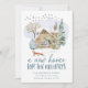 Elegant holiday moving announcement featuring a cozy watercolor brick home surrounded by snowy pine trees, a cute little fox out front, and birds flying overhead. "A New Home For The Holidays" is displayed in frost-blue hand-lettering. Personalize the design with your name and address. The card reverses to a snowy frost-blue background.