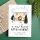Elegant holiday moving announcement featuring a cozy watercolor home surrounded by snowy lighted pine trees with cute rabbits in the snow. "A New Home For The Holidays" is displayed in dark pine green hand-lettering. Personalize the design with your name and address. The card reverses to a snowy dark green background.