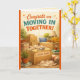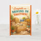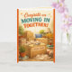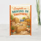 Celebrate the exciting milestone of moving in together with this warm and cheerful greeting card! Featuring a cozy illustrated scene of stacked moving boxes, soft packing paper, houseplants, furniture, and a shiny set of keys resting on top of a labeled box, this design perfectly captures the joy (and beautiful chaos!) of starting a new chapter under one roof.