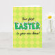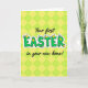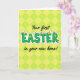 This card features a large central word in bright green with a white outline, giving the lettering a raised, sticker-like look. Small yellow egg-shaped accents sit on and around the letters like tiny spring decorations, adding a gentle, friendly charm 🐰. Thin green vines with little leaves curl through parts of the word, as if the letters are being softly wrapped in fresh growth. Around the main word, smaller supporting text appears in a flowing, cursive-style font, placed near the top and bottom in a dark contrasting color for easy reading. The overall layout feels like a sweet note between close friends, with the leafy touches and rounded shapes suggesting a tender, welcoming mood. Behind everything, a repeating diamond pattern made from alternating squares fills the background in lemon yellow and lime green 🌷. The pattern forms a tessellated grid that runs edge to edge, with the green and yellow shapes evenly spaced across the entire card front.