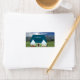 A cozy stylish homestead with a teal colored roof and lighter siding. Green grass and mountains in the background with a sunny blue sky. Customize with all of your new address information as desired.