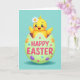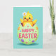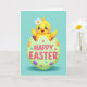 This design shows a cheerful yellow baby bird peeking out of a cracked pastel-green egg, its wide sparkling eyes and open beak giving it an eager, friendly look 🐇. A small white daisy with a golden center sits on its head, like a sweet little gift from a close friend. Soft rosy cheeks and tiny wings stretched outward add a tender, welcoming energy, as if it’s leaning in for a warm hello. Across the front of the egg, chunky rounded letters in bright fuchsia spell out a seasonal greeting, standing out against the pale shell. Small glossy dots in orange, purple, and blue are scattered around the lettering like candy sprinkles, adding extra texture and movement. The background stays a smooth aqua field, keeping the focus on the bird and egg while suggesting a calm spring day 🌷. A faint shadow beneath the egg anchors everything, and the shell’s jagged edges curl outward in light green fragments.