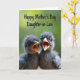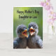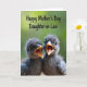 This card features a close-up scene of two tiny baby birds near the lower part of the front, nestled against a softly blurred green background that feels gentle and caring ❤️. Their charcoal-gray down is dotted with lighter flecks, and the fine, fuzzy texture makes them look as if they’re leaning into each other for comfort like close friends. Both birds tilt their heads upward with open orange-yellow beaks, showing soft pink mouths that read like a sweet, eager call for attention. Their shiny black eyes catch the light, giving them an innocent, slightly funny urgency that adds warmth to the moment. Near the top, the message “Happy Mother’s Day Daughter-in-Law” is placed in a flowing black style, centered so it floats above the birds without crowding them. The lighting stays soft and natural, adding delicate highlights along the feathers and gentle shadows beneath their faces. A small 🌼 detail is worked into the design near the text area, keeping the look tender and bright. The lower edge of the image holds the birds’ bodies in sharp focus while the green background fades smoothly into a calm blur.