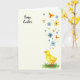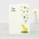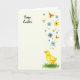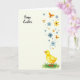 This card features a soft creamy ivory background with a small, round yellow chick standing near the lower edge on a gently shaded tuft of green grass. The chick’s bright orange beak and dark, curious eye tilt upward as if watching something lovely drift down, giving the scene a tender, friendly mood. From the upper right, a flowing trail of stylized flowers and tiny winged insects curves diagonally toward the chick, like a gentle shower of springtime confetti 🌷. The blossoms appear in calm light blue, deeper indigo, and warm marigold, spaced between golden-winged butterflies that seem to flutter in midair 🐇. In the upper left corner, a short greeting sits neatly in a dark ink-like color, small enough to feel intimate but easy to spot against the pale background. The overall lighting looks airy and soft, with the chick’s upward pose creating a sweet sense of connection with the drifting shapes above. Several butterflies are angled as if descending, their wings outlined in warm gold beside the blue and marigold flowers.