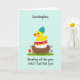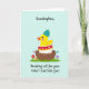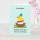 This card shows a newly hatched little yellow chick peeking out of a cracked eggshell, its small orange beak and rosy cheeks giving it a sweet, friendly look 🐣🌷. A blue cone party hat with white polka dots sits on its head, adding a cheerful touch without stealing the focus. The chick rests in a woven brown nest placed on a strip of rich green grass, where tiny flowers in red, orange, purple, and blue sprinkle the ground like little gifts. The eggshell pieces curve around the chick, and one section is decorated with a red band and small white starburst shapes. Behind everything is a smooth pastel aqua background that keeps the scene calm and airy, like a quiet moment shared between close friends. A short greeting appears centered near the top in a darker contrasting color, with a second line of text centered near the bottom in a matching tone, framing the illustration neatly 🐇. The nest’s braided texture is drawn with fine brown lines, and the grass blades angle upward in small strokes beneath the scattered blossoms.