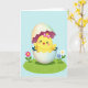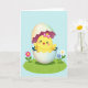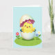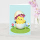 This greeting card shows a small, newly hatched yellow chick peeking out of a cracked pale eggshell, its round body softly shaded and its cheeks lightly pink. Wide, shining eyes and a gentle little smile give it a friendly, affectionate look, like it’s greeting someone special. A neat pink bow sits on top of its head, adding a sweet touch that feels like a tiny gift. The egg rests in a patch of green grass, where simple spring flowers in fuchsia, blue, and white bloom nearby 🌷. The background is a calm pastel blue, like an open sky that keeps the scene light and airy. Short Easter text sits near the top in a soft pink color, centered and easy to read, leaving plenty of space around the illustration. Fine details show jagged shell edges and small blades of grass, with even lighting that makes the chick look softly plush 🐰. A few scattered blossoms sit along the lower edge of the grass, with one white flower closest to the shell on the right.