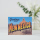 This striking, retro-style design features the iconic "Greetings from NEW MEXICO" typography set against a traditional desert landscape. The background prominently features a historic adobe mission or church, reflecting the state's deep cultural and architectural heritage, typical of the Santa Fe and Pueblo regions. Perfect for fans of vintage travel posters, retro artwork, Southwest history, and the unique beauty of the Land of Enchantment. This makes an ideal souvenir or gift for travelers and locals.