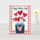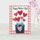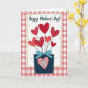 This Mother's Day card features a bouquet of seven heart-shaped blooms in rich red and soft coral, with a few dotted accents that add a flirty, friendly touch ❤️. The hearts rise on thin black stems from a deep navy container that looks like a decorative pocket or little pot. A sky-blue ribbon is tied into a neat bow around the stems, like a gentle hug holding everything together. The main artwork sits on a white rectangle sprinkled with a few tiny gold flecks that catch the eye like quiet confetti 🌼. Around that white panel, a dashed border line adds a cozy, homey detail without taking over the design. Near the top of the white space, the phrase “Happy Mother’s Day!” appears in dark blue lettering that matches the container. Inside the navy container, a small red heart with a checkered pattern includes the words “new mom” in simple lettering. Behind the central panel, the background is a red-and-white gingham pattern that frames the scene with a picnic-cloth look.