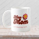 Surprise the new mom in your life with a gift that celebrates her journey with a touch of retro charm. Featuring the words "New Mom, Established 2024" and easy to customize for any year. Groovy typography in pink and brown tones is accompanied by a cute flower sticker graphic.