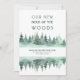 Our New Neck of the Woods Moving Announcement card which you can customize with your names, new address and any additional information you want to include. The design features a watercolor forest border of green pine trees and decorative typography for the opening headline "our new neck of the woods".