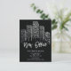 Modern city new office moving announcement postcard featuring city buildings with white lights set on a black background.