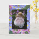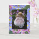 Congratulations you have a new sister text on lilac floral bordered card with pretty little doll in lilac dress in garden scene with floral background