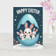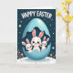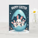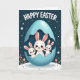 This card shows a large pale blue egg cracked open, with three white long-eared bunnies peeking out 🐰. The biggest bunny sits in the middle with wide eyes and a gentle smile, while two smaller ones lean in close on either side, their rosy cheeks and shared glance suggesting closeness like best friends. Soft pink details on their ears and noses add warmth against the deep navy interior of the shell. The background is a rich, dark blue field sprinkled with glowing dots in white, peach, and light blue, like floating lights in the night 🌷. Along the bottom, a smooth white snowy-looking ground curves across the scene, dotted with coral-colored flowers and beige leaves. A short Easter greeting appears near the top in large white letters, centered and easy to read against the dark sky. The cracked shell edge is outlined with gentle shading, and the egg’s pale surface fades subtly from lighter to slightly deeper blue.