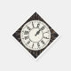 Clock with Roman numerals on fireworks with gold confetti falling for New Year's Eve party.