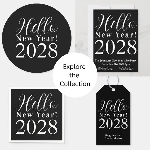 This is a modern and chic, New Year's Eve celebration design. It is in classic and elegant black and white with a modern typography script design. It has the message, "Hello New Year! 2028". Ideal for your New Year's Eve Party or celebration and perfect for envelope or party favor seals. To personalize, simply add your name, the celebration year and party information, by using the personalize this button, here you can also change the rest of the text if you want to. Check out the design editing tool to change the color or font. If you need help with personalization, matching products, or for a custom design, contact me via zazzle chat or email: ursuladawnmoon@gmail.com Happy New Year!
