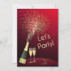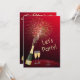 Ring in the New Year in style with this red and gold Let's Party! invitation with a champagne bottle bursting open with fireworks and gold text, along with two champagne glasses, sitting on a disco ball base and striped streams of lighter red with stars on it. The design is carried over to the back, where you can customize the details with your own information. If you need any help, or if you need any matching items, please email niteowlstudio@gmail.com.