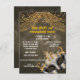 A big mask with hanging string lights on a golden bubbly background makes this a pretty neat invitation.