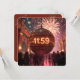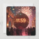 As fireworks burst in the night sky, a large metallic shiny ball shows '11:59' while a crowd gathers beneath an archway to watch the dazzling display/