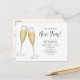 This design features a simple new years eve day, party champagne wine celebration festive, trendy stylish gold bubbly toast, a watercolor champagne flute glasses glass, elegant calligraphy script text font, a whimsical typography style design, a modern Christmas holiday glitter, a classy-vintage retro cute simplistic, family friends get together party with Facebook events page URL link