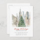This festive Christmas holiday moving announcement features the saying "Happy Holidays from Our New Place" with a beautiful watercolor city street with a big Christmas tree. The announcement is perfect for sending to friends and family during the holiday season to let them know about your new address. The front of the announcement features the saying and the watercolor snowy city street scene, and includes your new address and contact information. The overall design is festive and charming, and the announcement is sure to put a smile on the faces of your loved ones.