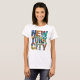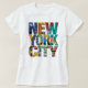 Pop Art graphic of New York City type with a composite of various New York icons inside. The artwork consists of, the Brooklyn bridge, the Chrysler building, a slice of pizza, a yellow taxi cab, the Statue of Liberty, the 5 boroughs map, the subway, an apartment building with a fire escape and Wall Street and Broadway street signs.