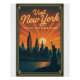 Retro-style travel poster of the New York City skyline at sunset, viewed from across the Hudson River. Iconic landmarks such as the Empire State Building