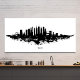 The skyline itself, positioned centrally across the horizontal plane, is depicted as a detailed yet stylized silhouette of New York City's famous landmarks. Easily recognizable structures, including the Empire State Building, Chrysler Building, One World Trade Center, and the Brooklyn Bridge, are grouped into a dense, vertical cluster of buildings that convey the energy and scale of Manhattan. The silhouette is solid and defined, standing against the void, but the bottom of the entire scene transitions dramatically into a chaotic explosion of watercolor splatters, drips, and abstract washes. This watercolor effect creates the impression of the city anchored in or rising from a powerful, turbulent pool of ink, blending the rigid lines of the built environment with the unpredictable, organic nature of water and ink.