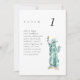 Chic wedding table number seating chart cards featuring a watercolor painting of New York City's Statue of Liberty. The pairing of the painterly watercolor and the chic typography makes for a beautifully fun combo.