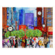 Busy New York street art scene with variety of people crossing the street while cars and trucks at a stop. Bright with multicolors and much detail with clock tower, large vintage street clock, street lights, many windows, blue sky and few clouds, green leafy trees in background, signs, lettering on buildings, vintage street light and New York Public Library flag and an American flag. Poster print. Artwork by Patricia Villa.