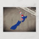 Postcard with an outline of New Zealand, colored in the design of the national flag.