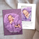 Announce your baby's arrival with our elegant birth announcement, featuring a vertical photo of your little one with their first name beautifully overlaid in white calligraphy script. You can personalize the announcement with your baby's middle and last name. On the back, there's space for an additional picture, along with birth statistics and a personal message.