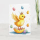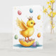 Designed with a springtime scene, this card centers on a fluffy golden-yellow hatchling stepping out of a jagged cracked eggshell that sits on a soft swirl of muted blue. A tiny gold crown with star-like points rests on its head, giving it a sweet, storybook look. The chick’s large dark eyes seem to meet yours with an eager, friendly gaze, and its small orange beak is open as if chirping hello. One wing stretches outward like it’s reaching toward a close friend, adding a gentle, affectionate energy to the pose 🐰. Around it, pastel eggs in soft pink, sky blue, light green, sunny orange, and pale lavender float against a bright white background, like they’re circling in a quiet celebration. Small sparkling marks and scattered colorful dots decorate the outer area, while the greeting text sits near the top in a soft pastel shade with smaller wording near the bottom in a matching tone 🌷. The lighting stays soft and even, highlighting the downy texture of the chick and the smooth shine of the eggs. Tiny speckles and sparkles appear near the edges, with the pastel eggs drifting in a loose ring around the crowned chick.