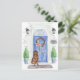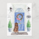 Announce your new address with our stylish announcement featuring a Newfoundland, blue front door, welcome mat, slate sign, topiaries and a floral wreath set on a gray brick background.